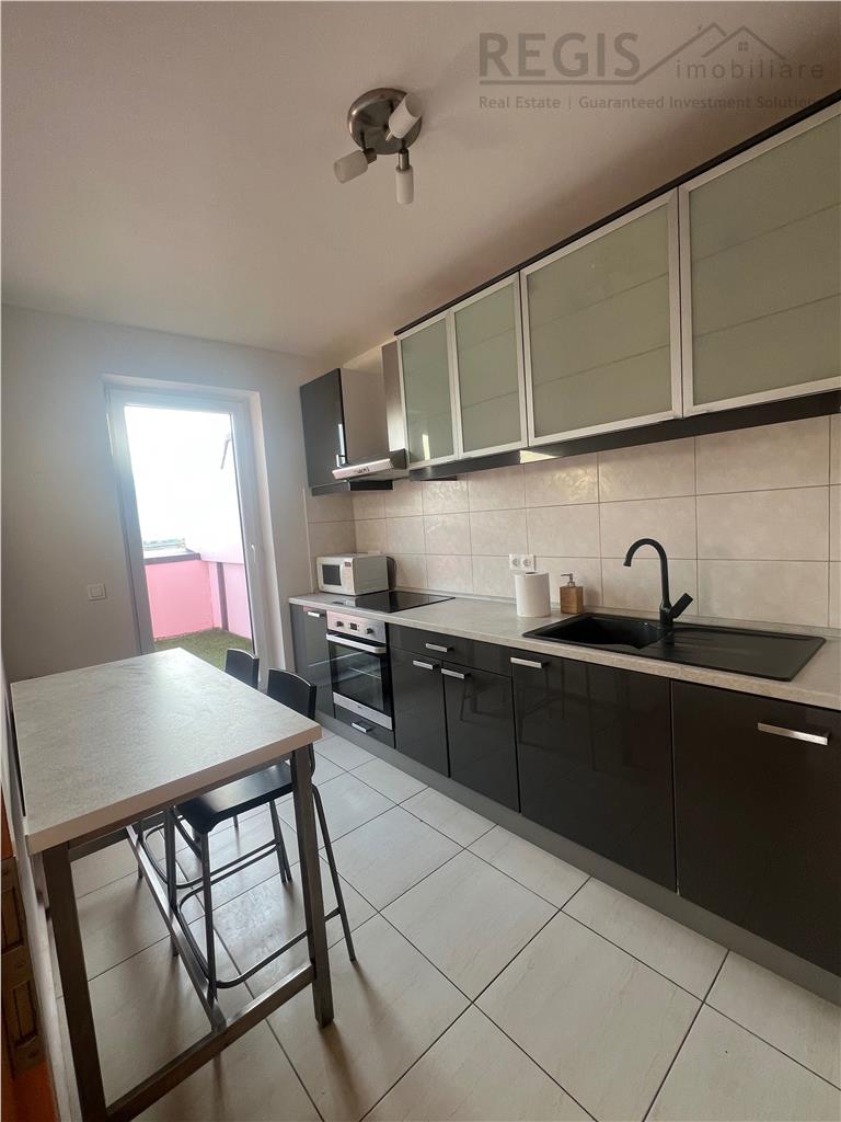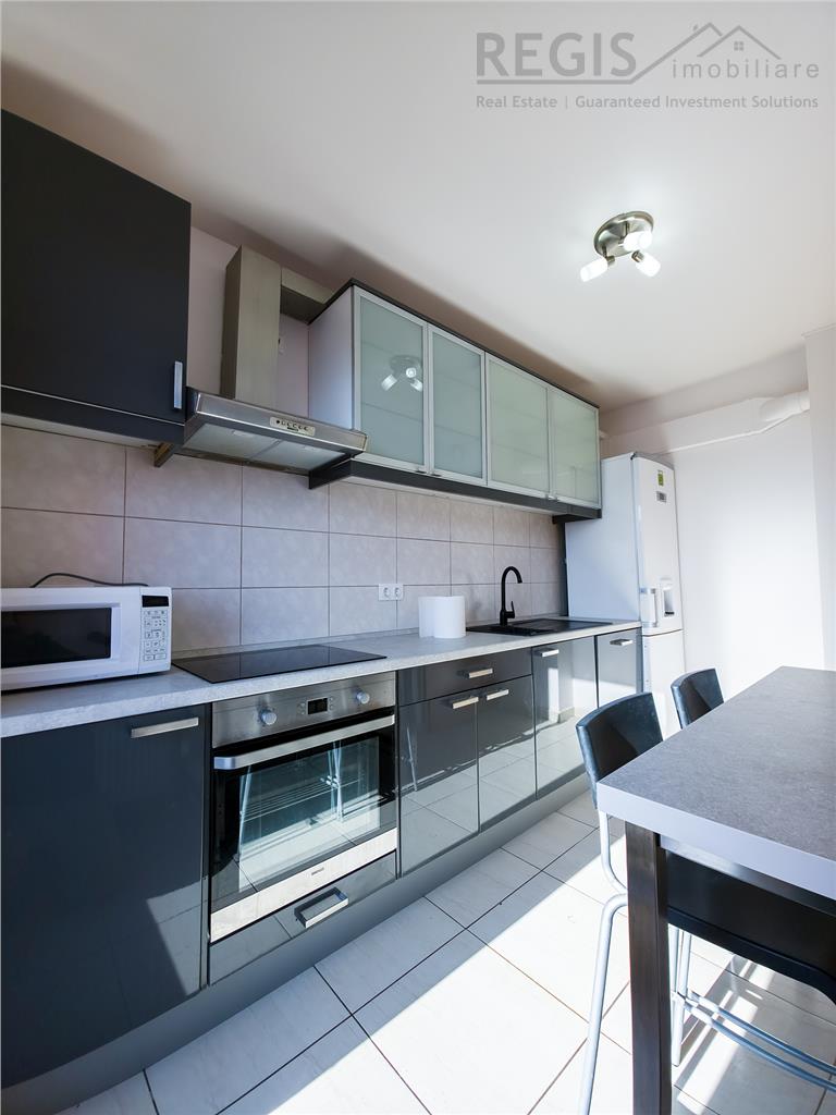 -Bucatarie este moderna si incapatoare, complet mobilata, utilata cu plita electrica, cupor, hota, frigider, microunde, masina de spalat vase si spatii pentru depozitare