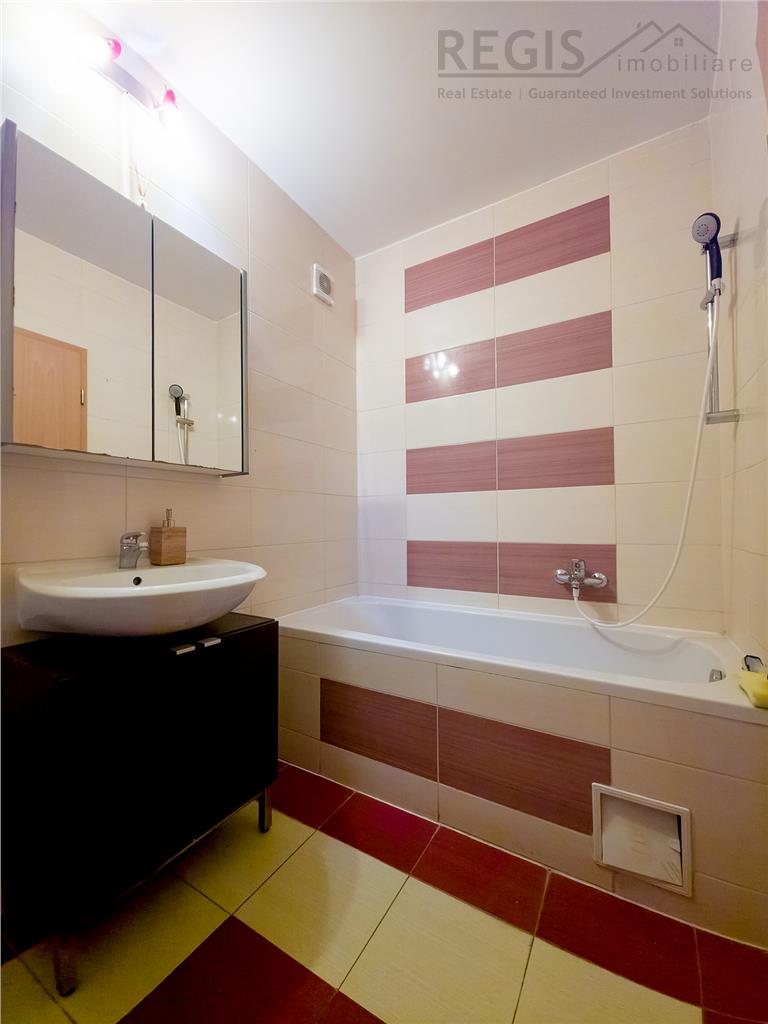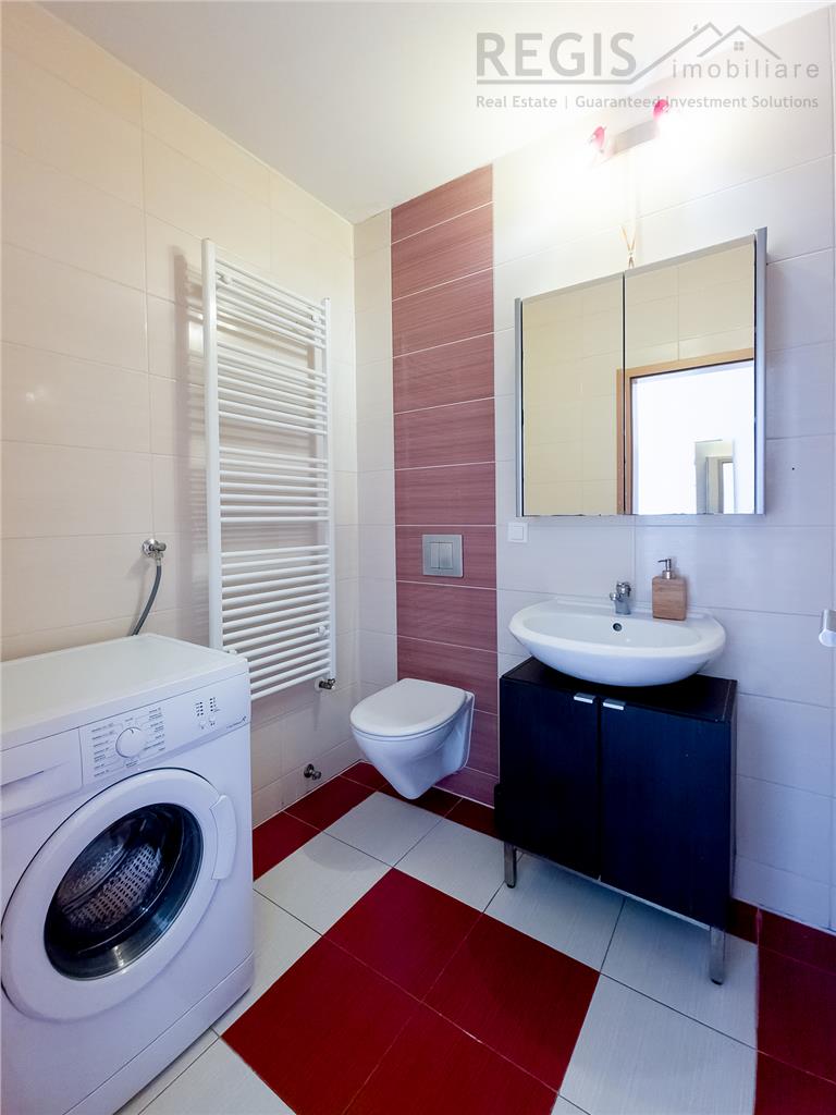 -Baie complet mobilata, dotata cu masina de spalat si dus cu cada