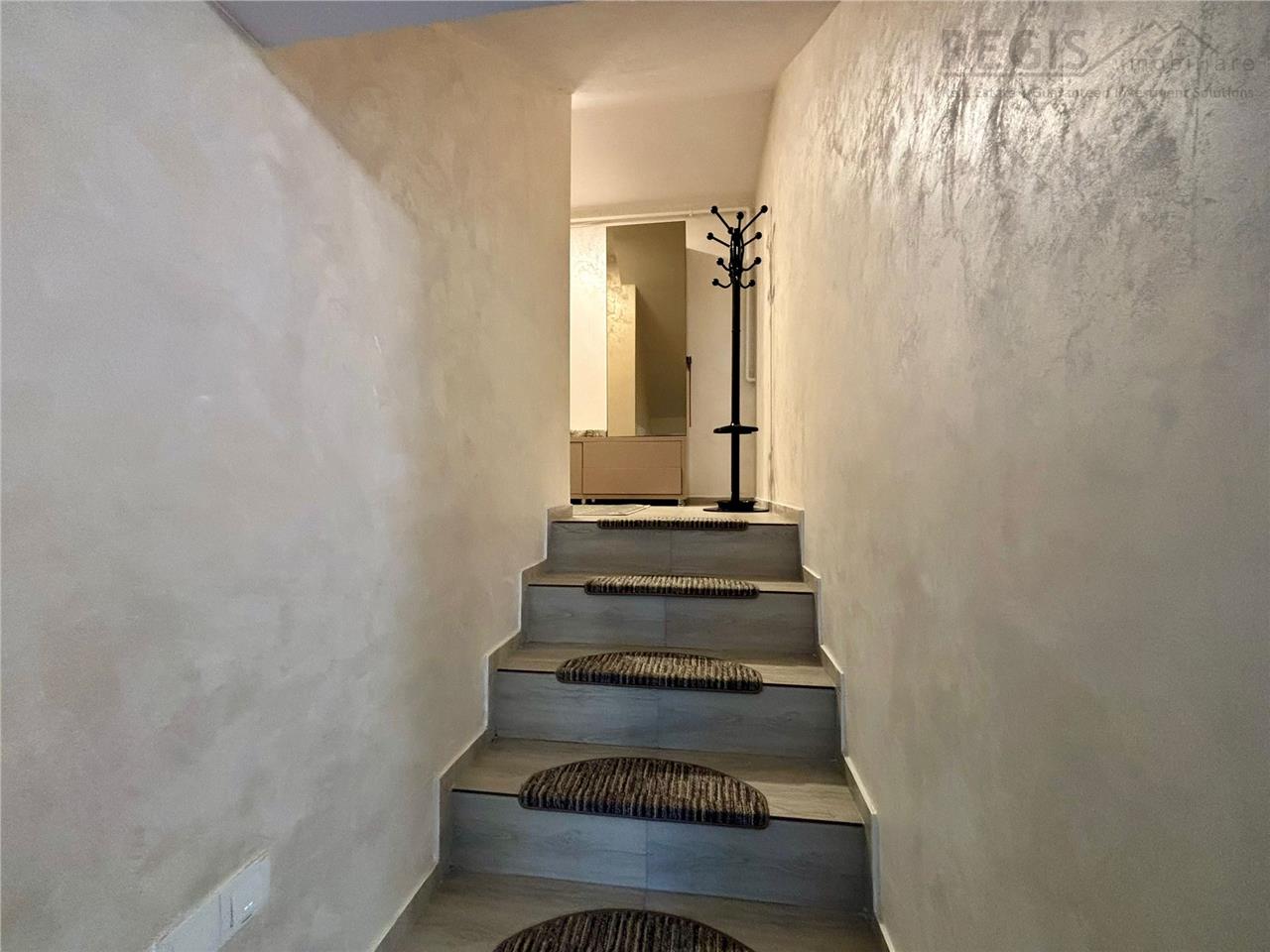 Mobilat moder: prezinta pat matrimonial si dulap tip dressing in dormitor; canapea mare, fotoliu si masuta de cafea in living; masa cu 6 scaune si spatii pentru depozitare in bucatarie.