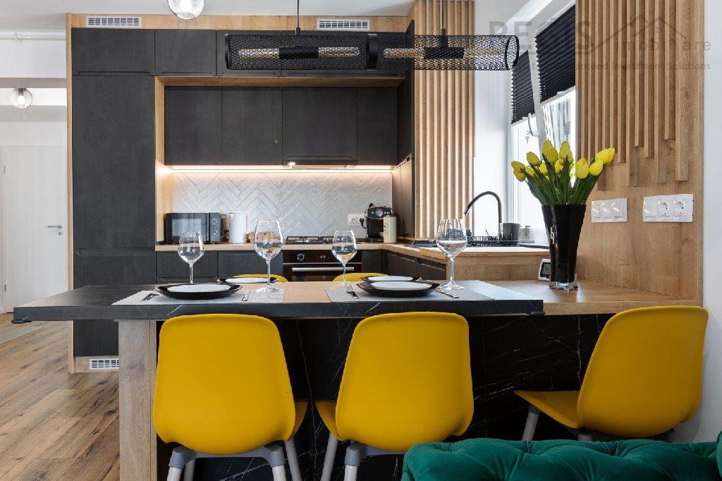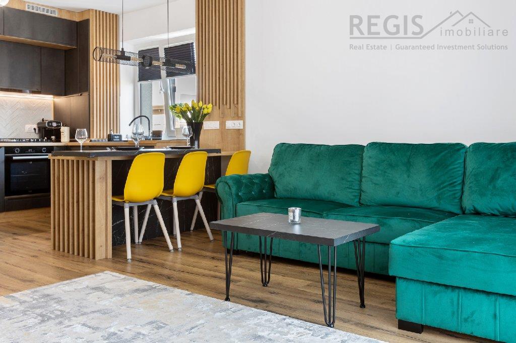 Spatios, luminos, mobilat modern, cu zona de relaxare si acces spre bucatarie.Televizor diagonala 176 cm.