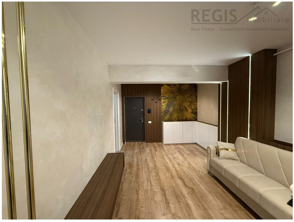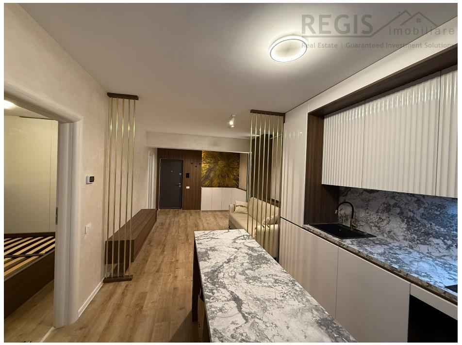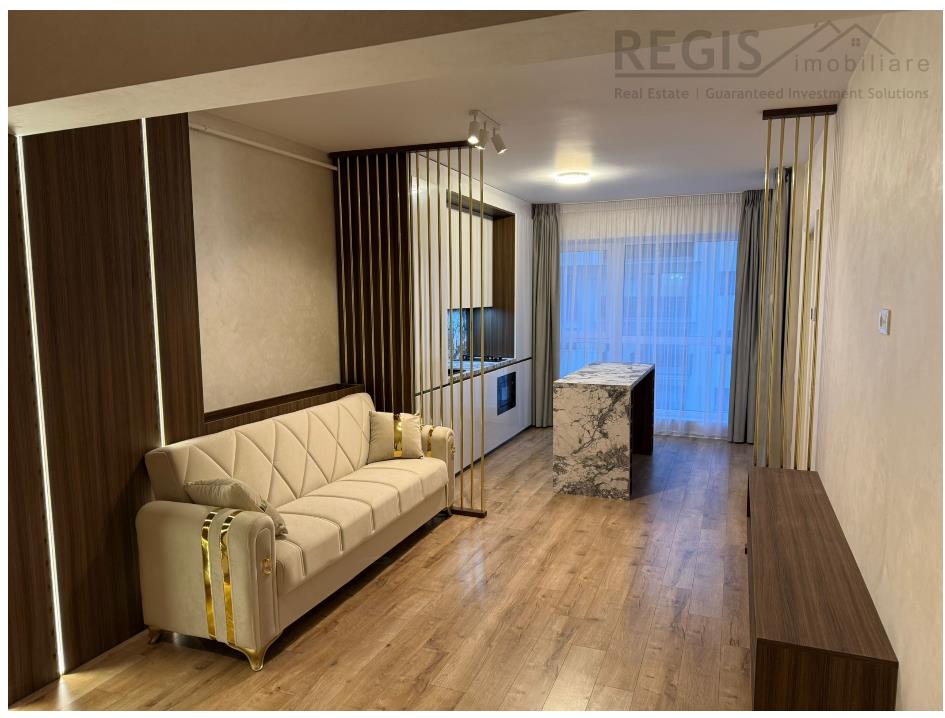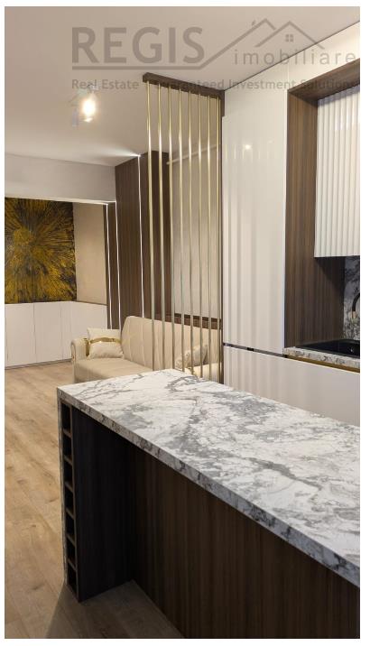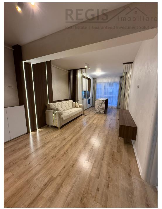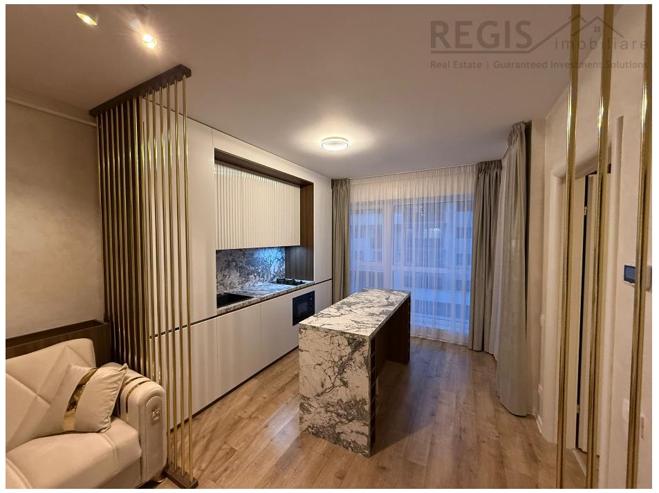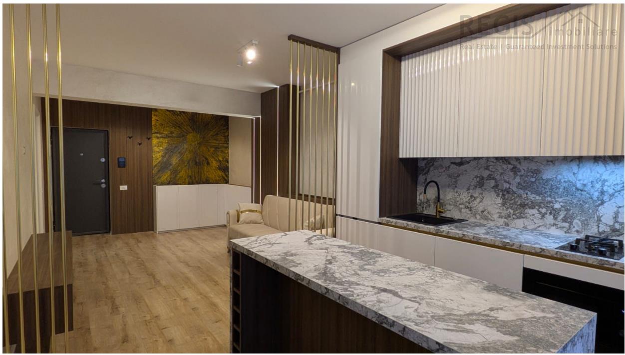 Apartamentul are un spațiu deschis (open-space) care integrează zona de living, bucătăria și locul de dormit într-un mod armonios. Pereții sunt finisați în nuanțe neutre, pentru a amplifica lumina naturală . Podeaua este acoperită cu parchet în tonuri naturale.