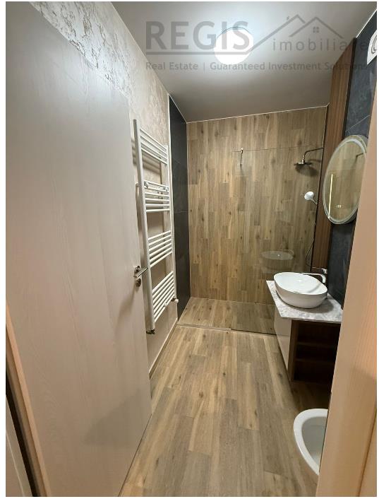 Baia are un design minimalist, cu duș walk-in, cabină din sticlă transparentă, obiecte sanitare suspendate și oglindă mare cu iluminare LED.