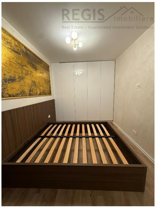 Zona de dormit este delimitata de un perete, păstrând senzația de spațiu aerisit. Mobilierul cu pat matrimonial si dressing generos,creaza un spatiu intim.Spațiile de depozitare sunt integrate inteligent – dulapuri încorporate până în tavan și sertare ascunse.