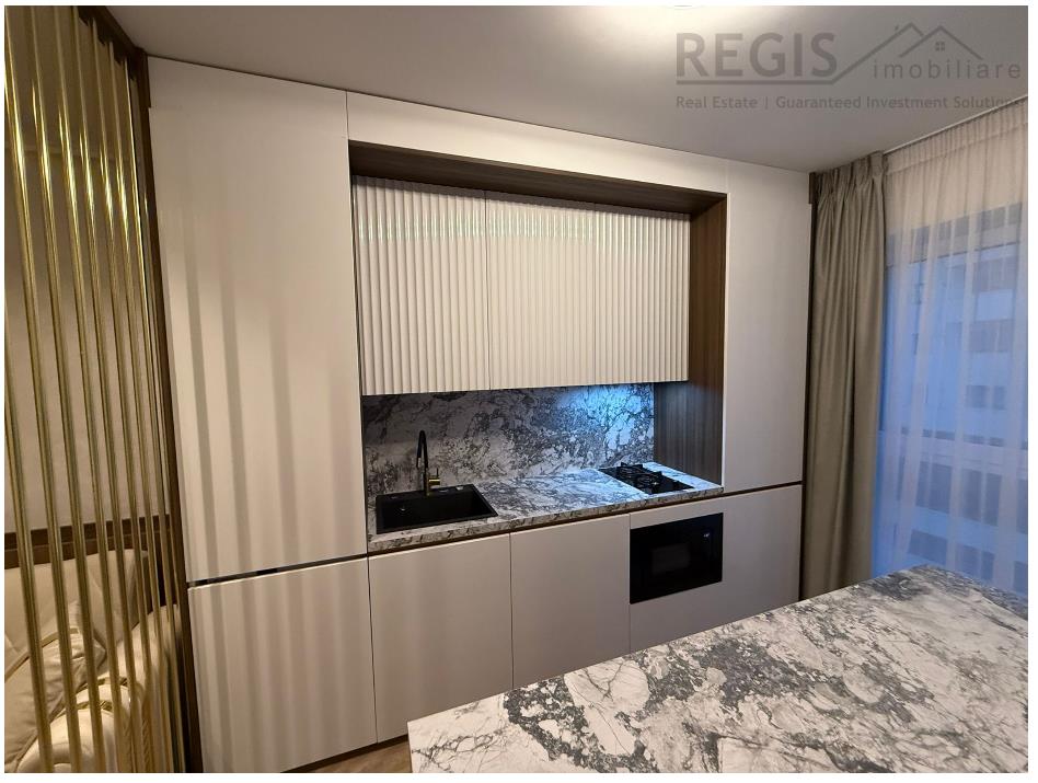 Bucătăria este compactă, dar complet utilată, cu mobilier de culoare bej fără mânere vizibile (sistem push), blat din compozit și electrocasnice încorporate. Iluminatul este bine gândit: spoturi LED încastrate în tavan, benzi luminoase sub corpurile suspendate .