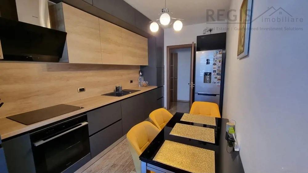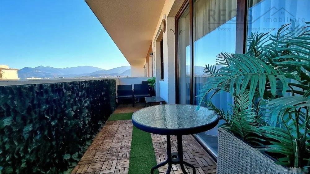 Apartamentul are o suprafata de 80 mp utili, este luminos si insorit, dispune de o terasa mobilata si este situat la etajul 10/10 al unui imobil construit in 2021, dotat cu doua ascensoare. Ofera o priveliste spectaculoasa catre munti.