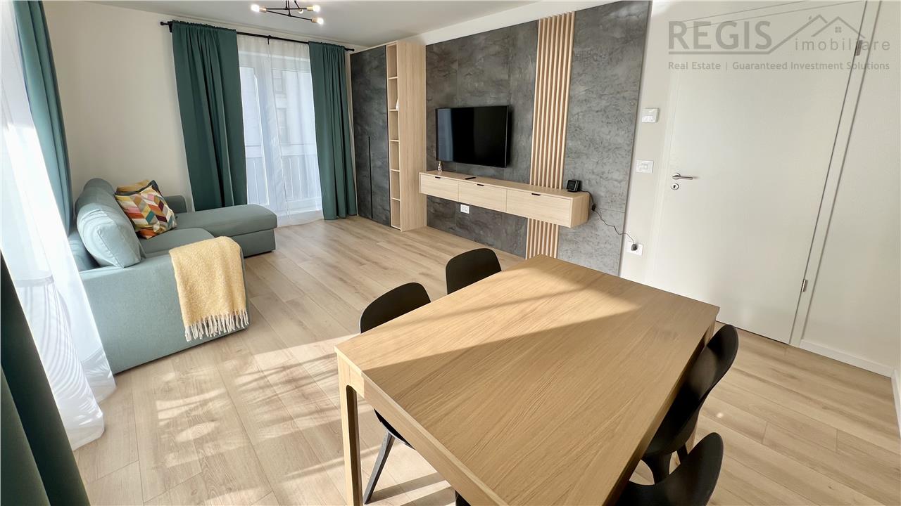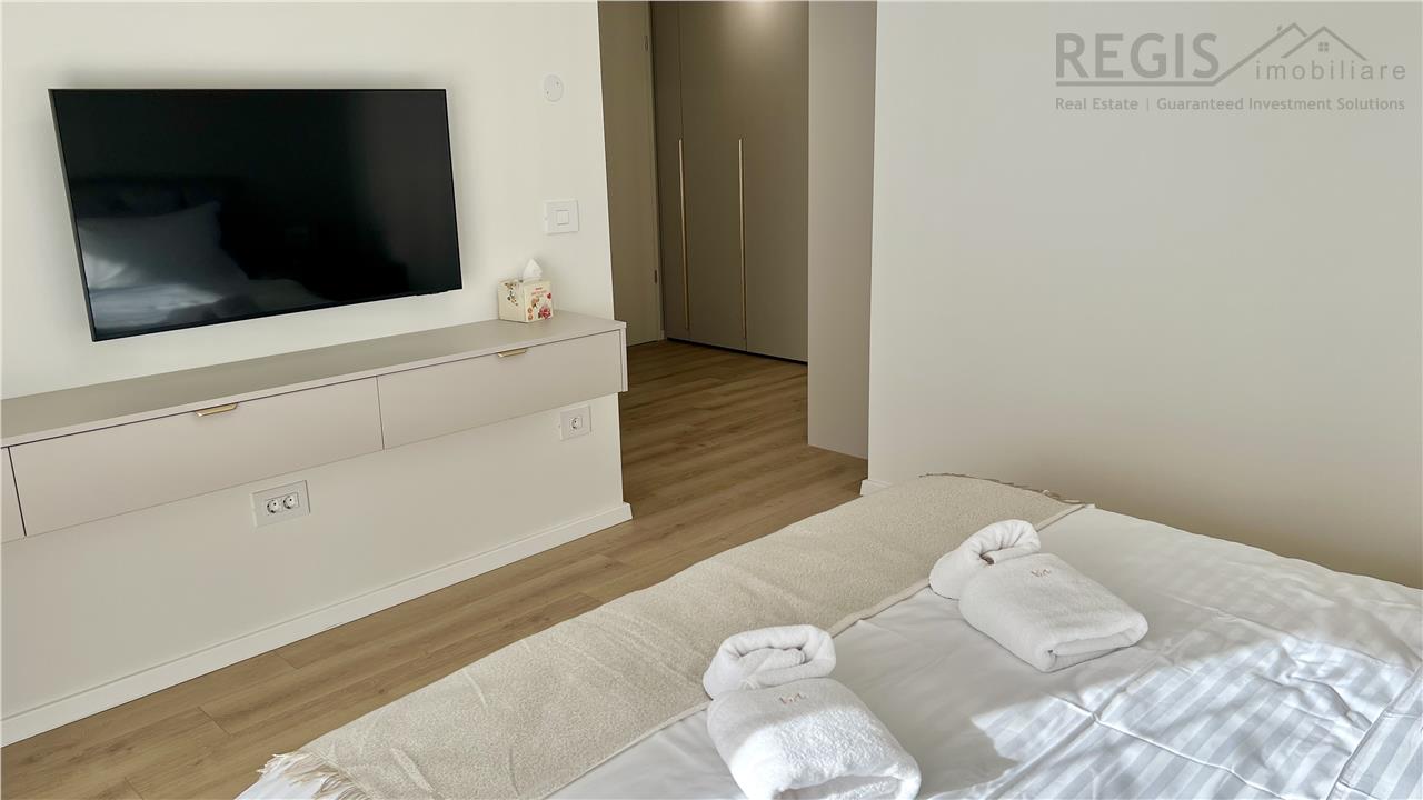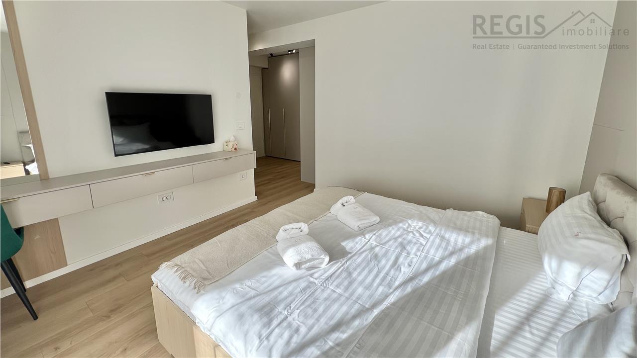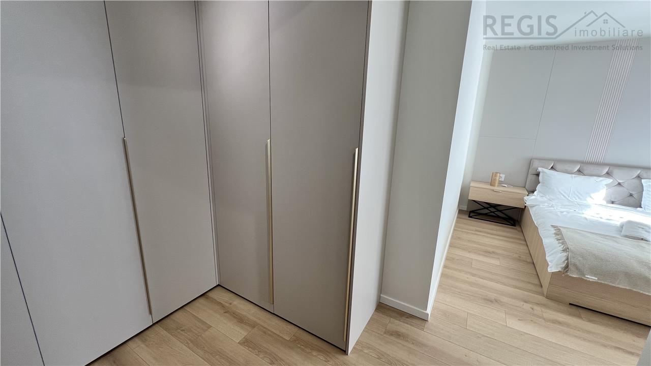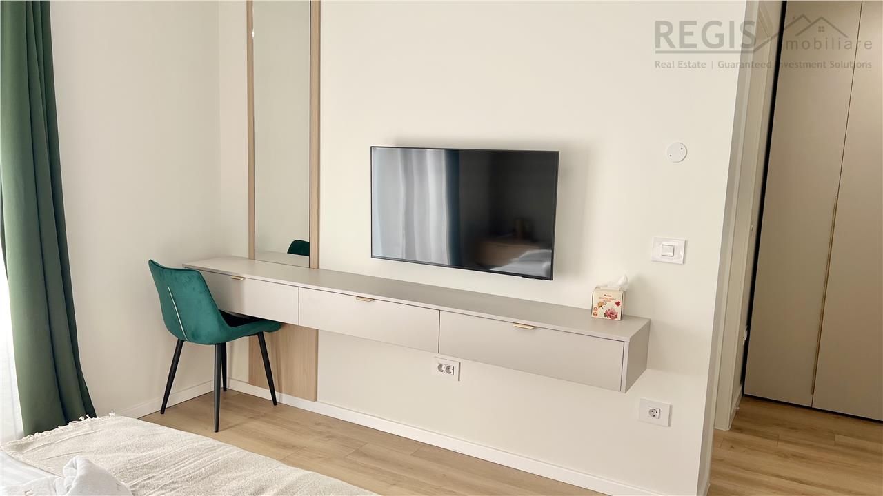 Interiorul apartamentului este decorat cu gust, imbinand elementele naturale precum lemnul deschis la culoare cu accente moderne. Livingul dispune de un perete decorativ elegant, completat de un televizor si mobilier suspendat. Dormitoarele sunt luminoase si primitoare, iar terasa ofera un spatiu generos pentru relaxare.