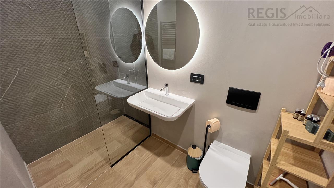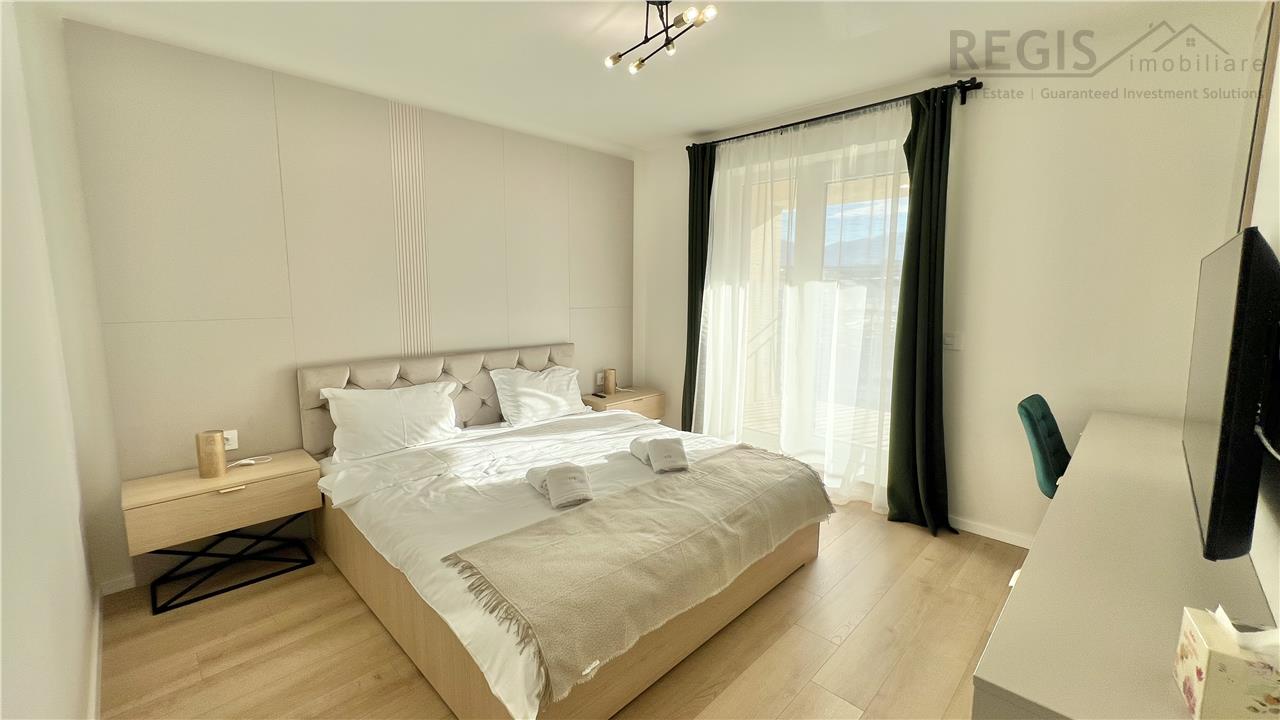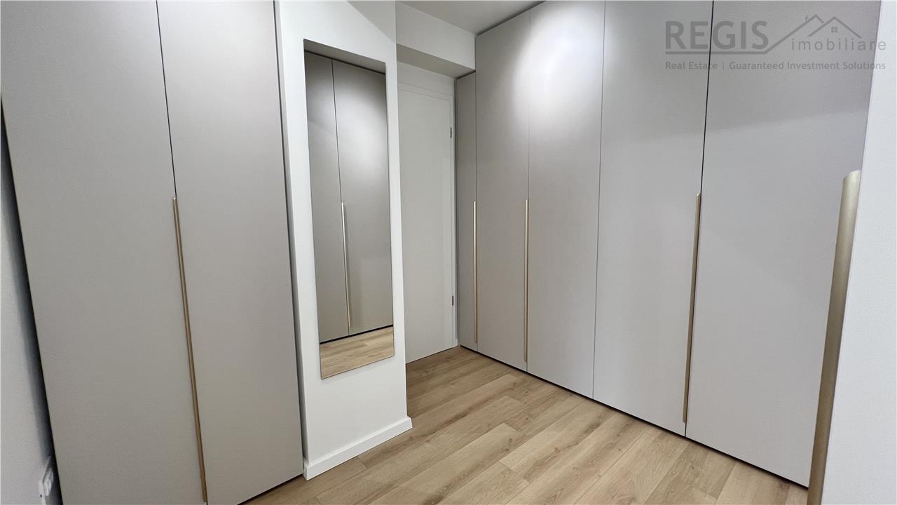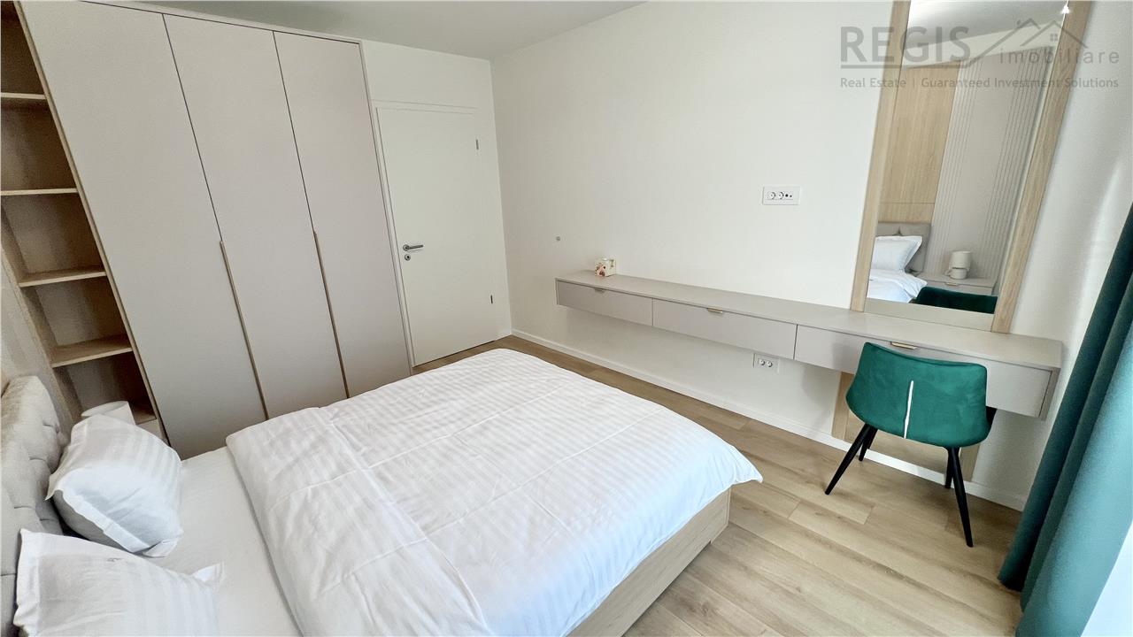 Interiorul apartamentului este decorat cu gust, imbinand elementele naturale precum lemnul deschis la culoare cu accente moderne. Livingul dispune de un perete decorativ elegant, completat de un televizor si mobilier suspendat. Dormitoarele sunt luminoase si primitoare, iar terasa ofera un spatiu generos pentru relaxare.
