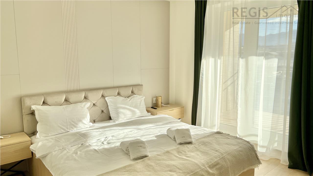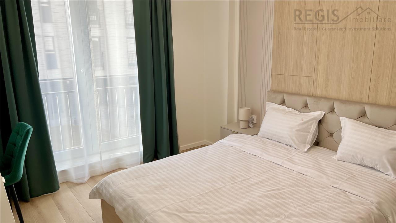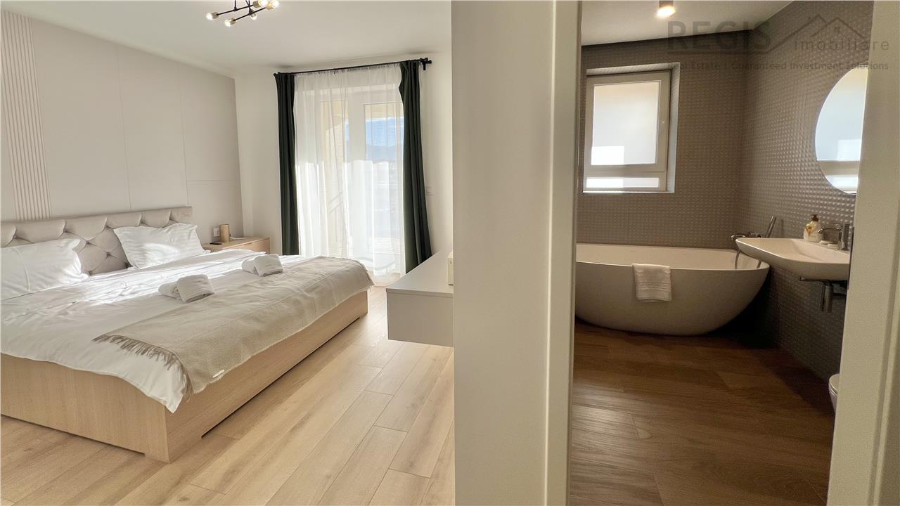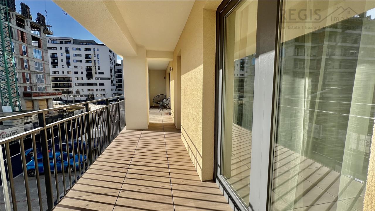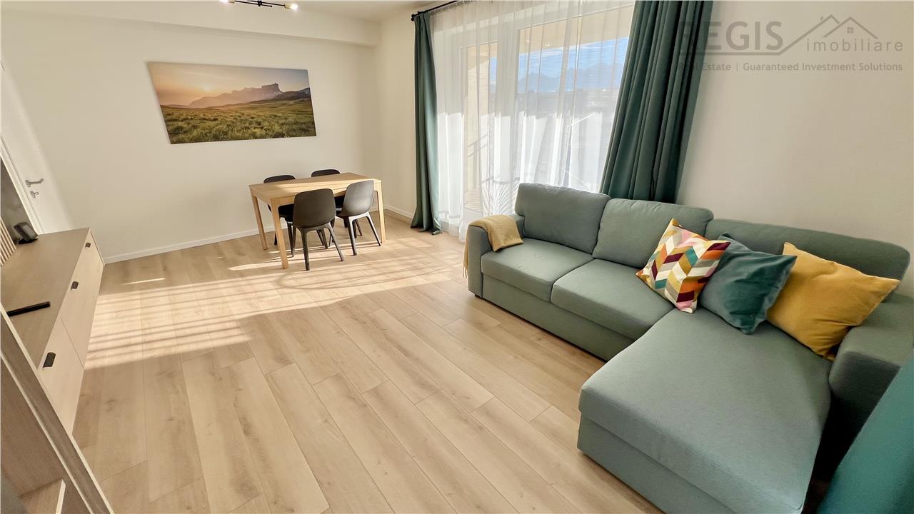Interiorul apartamentului este decorat cu gust, imbinand elementele naturale precum lemnul deschis la culoare cu accente moderne. Livingul dispune de un perete decorativ elegant, completat de un televizor si mobilier suspendat. Dormitoarele sunt luminoase si primitoare, iar terasa ofera un spatiu generos pentru relaxare.