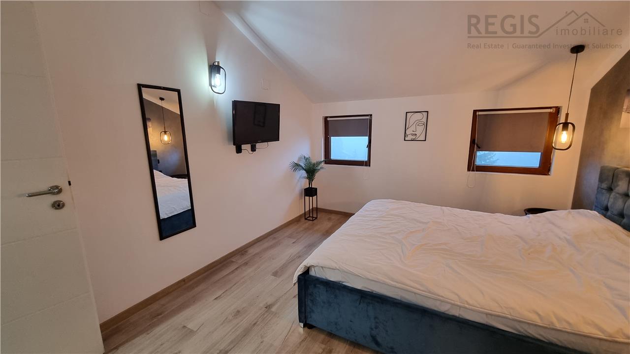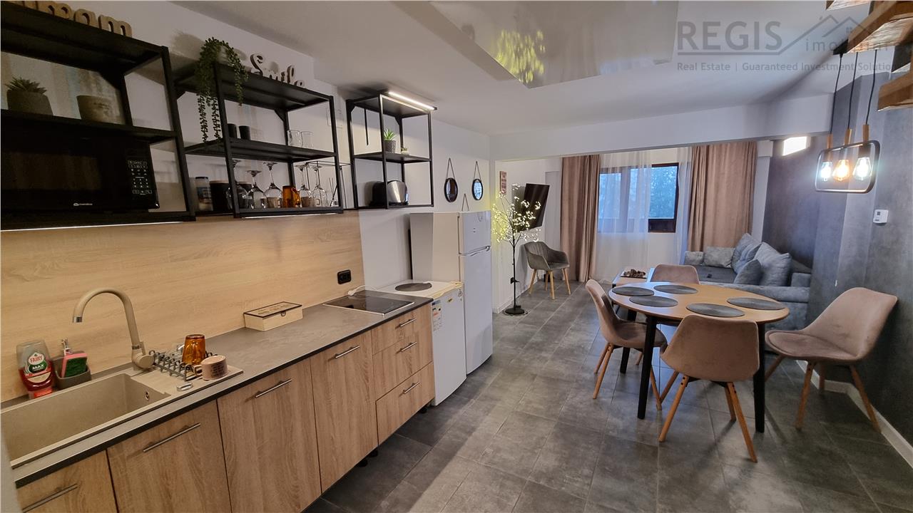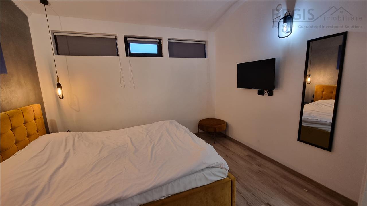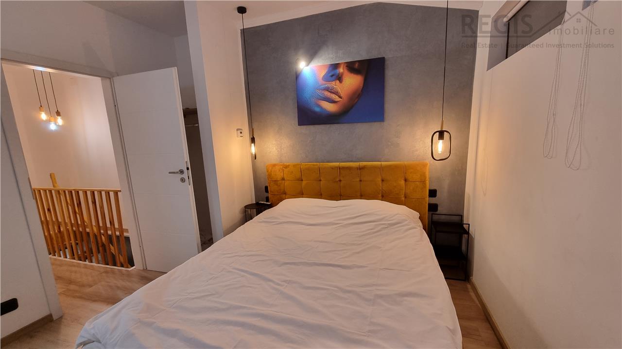 Apartamentul este complet mobilat si utilat , situat la etajul 4 si 5 intr-un complex rezidential inclinat spre inchirierea in regim hotelier , dispune de bucatarie baie si living room open space la etajul 4 , prin scara interioara la etajul 5 , doua dormitoare cu baie fiecare .