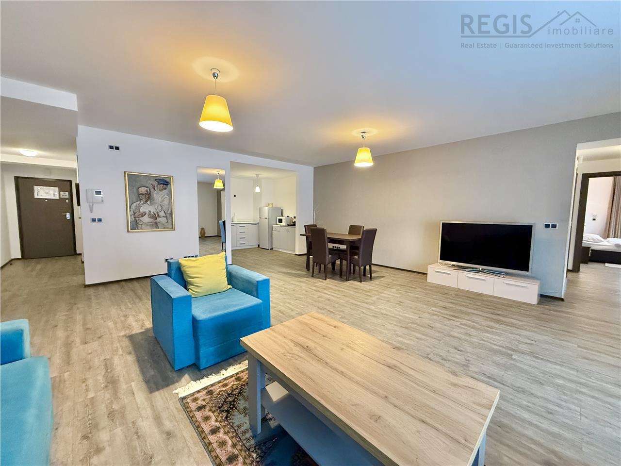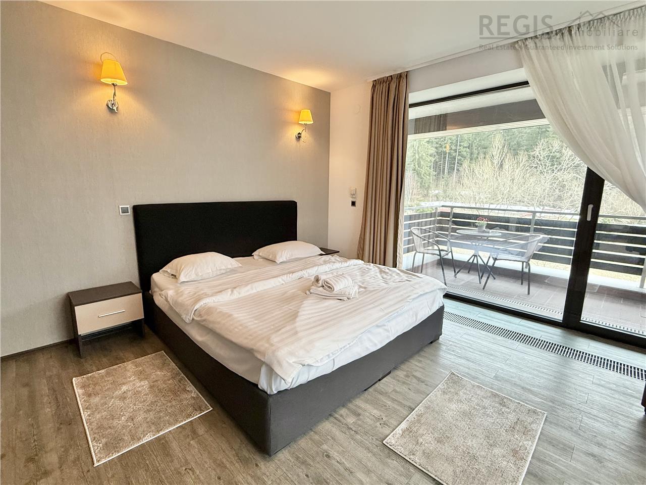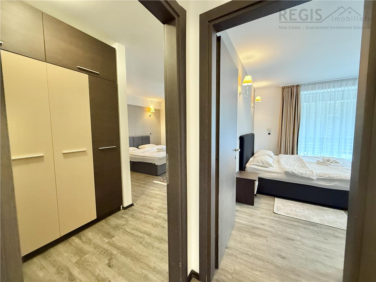 Cuvantul care descrie cel mai bine proprietatea este Eleganta. Compartimentarea este una lineara, cu zone mari vitrate, cu dormitoarele foarte mari situate in zonele laterale iale apartmentului iar pe zona centrala fiind dispus livingul spatios cu chicineta usor retrasa si locul de luat masa. Proprietatea este atractiva si foarte accesata in regim hotelier, la amenajare proprietatii s au folosit elemente in culori calde si luminoase. De cum vei pasi in aceasta proprietate te va invalui atmosfera de confort, lux si eleganta, totul in mijlocul naturii.