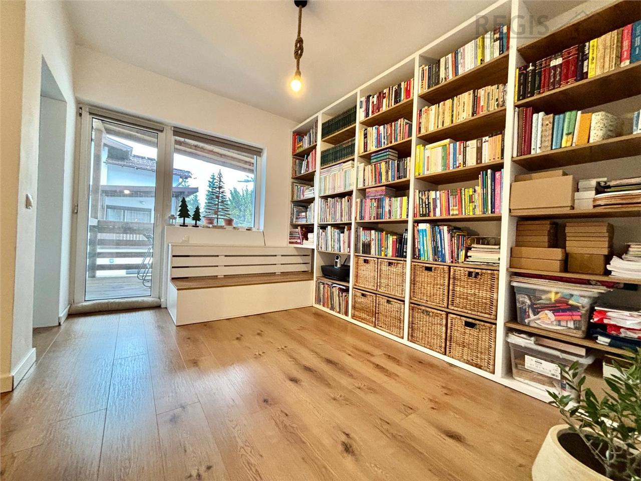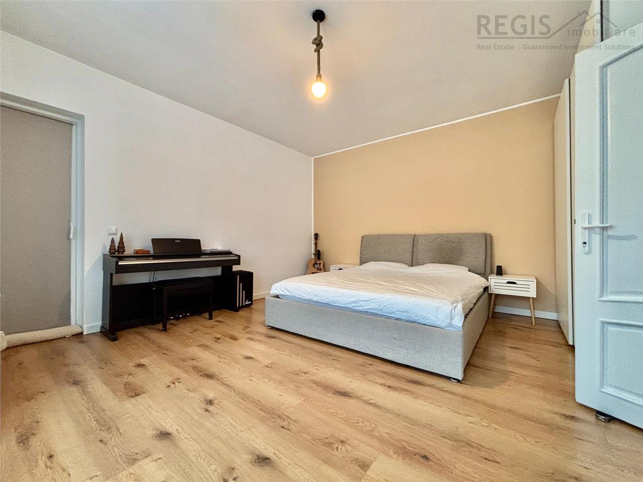 Etaj - Dormitor generos cu balcon , zona de zi ( transformata in biblioteca) toaleta cu dus, terasa.