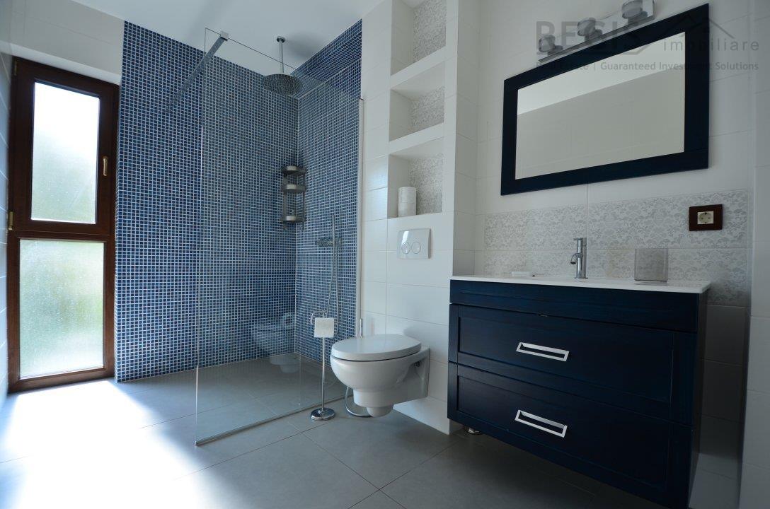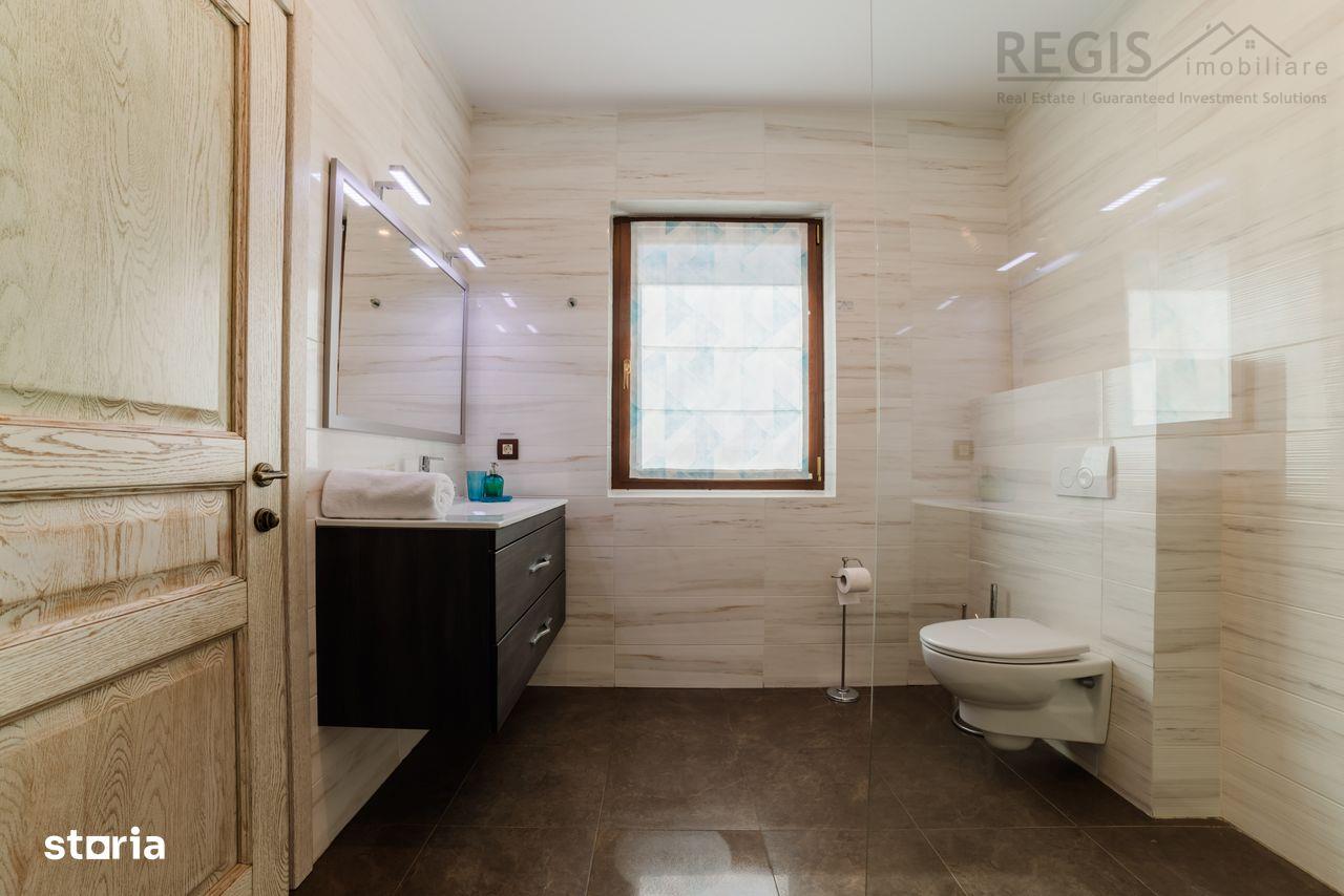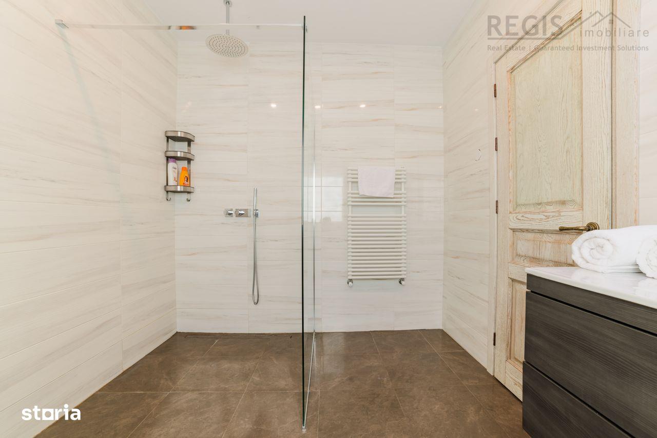 La etaj, un living, dormitorul principal cu baie si dresing + alte 2 dormitoare si baie. Toate camerele sunt prevazute cu balcoane si mobilate complet.