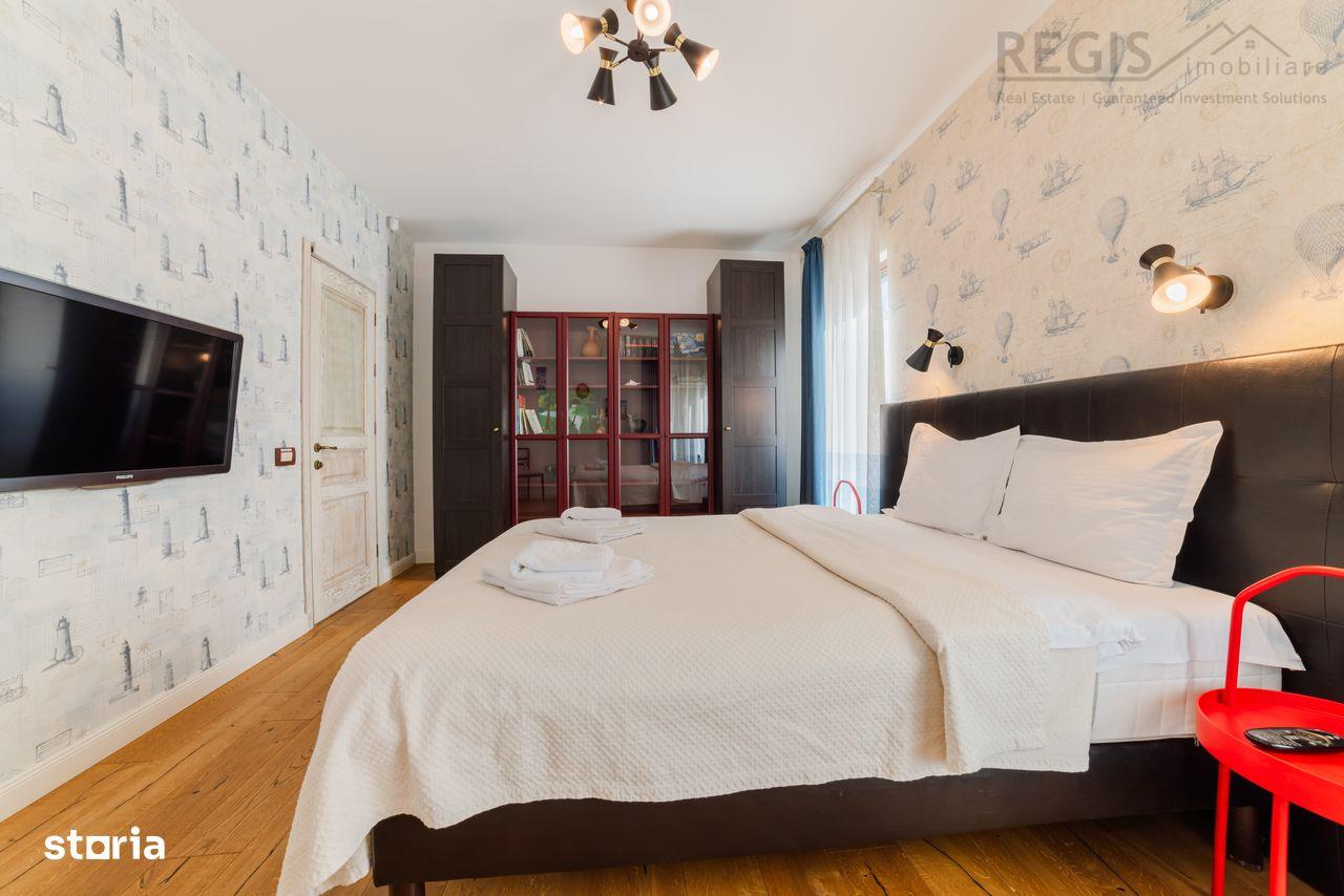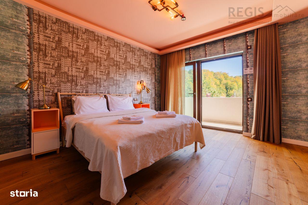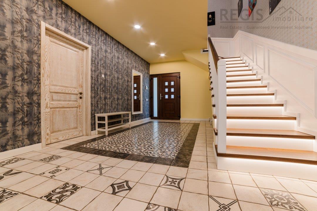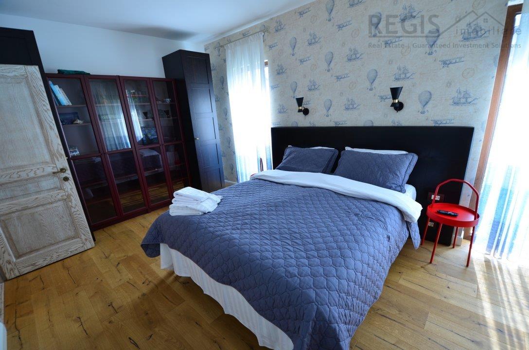 La etaj, un living, dormitorul principal cu baie si dresing + alte 2 dormitoare si baie. Toate camerele sunt prevazute cu balcoane si mobilate complet.