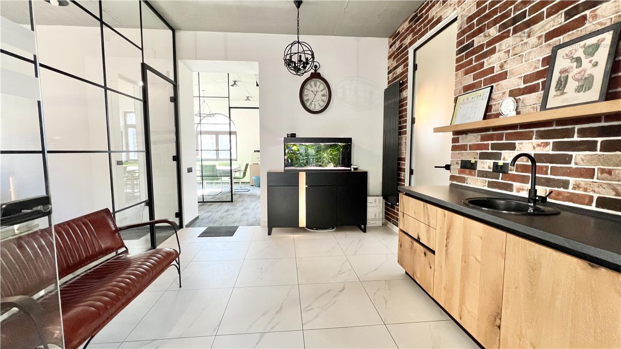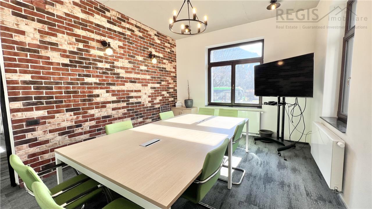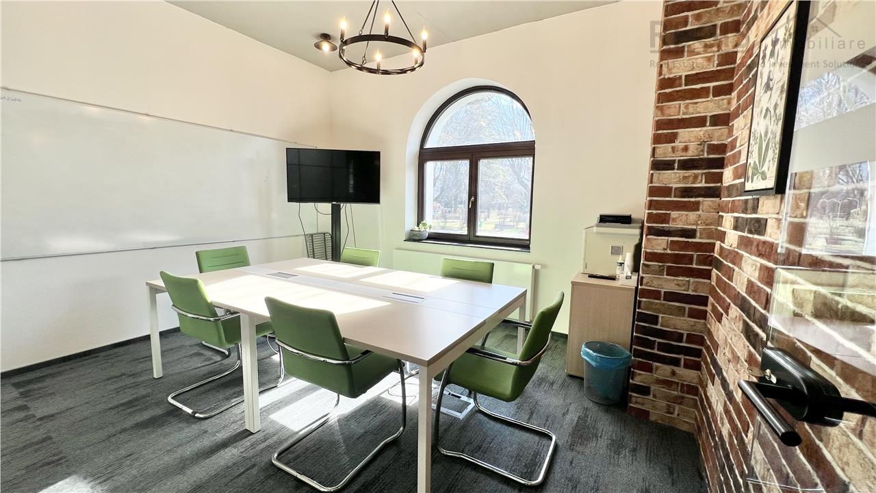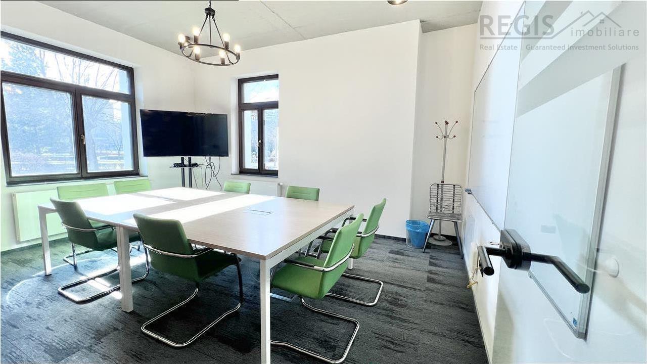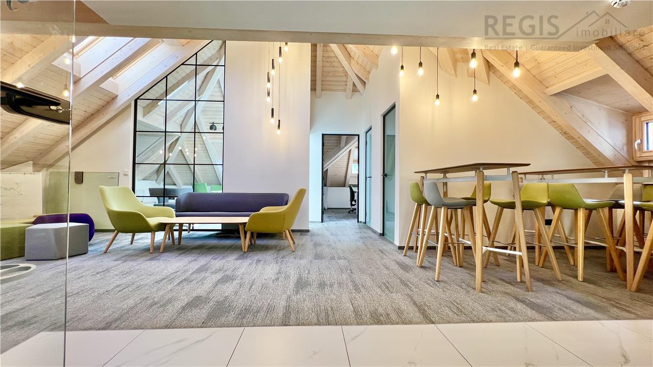 Imbinarea armonioasa dintre elementele clasice – lemn masiv, parchet, tencuieli decorative – si accentele contemporane precum pereti din sticla, mocheta de trafic intens si dotari tehnice moderne, creeaza un ambient profesional distinct si un cadru de lucru la standarde ridicate.